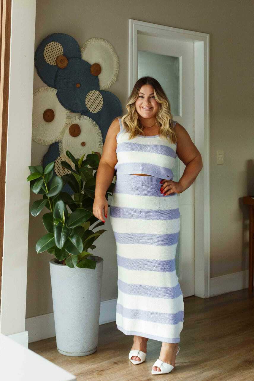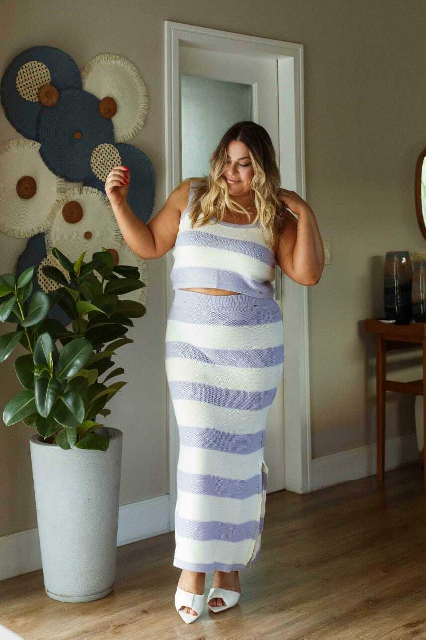 O conjunto é composto por saia longa em listras lilás e branco, confeccionada em tecido leve e fluido da linha verão, com fenda lateral que garante movimento e um toque de sensualidade na medida certa. Acompanha um cropped moderno e confortável, que completa o visual com sofisticação e praticidade.