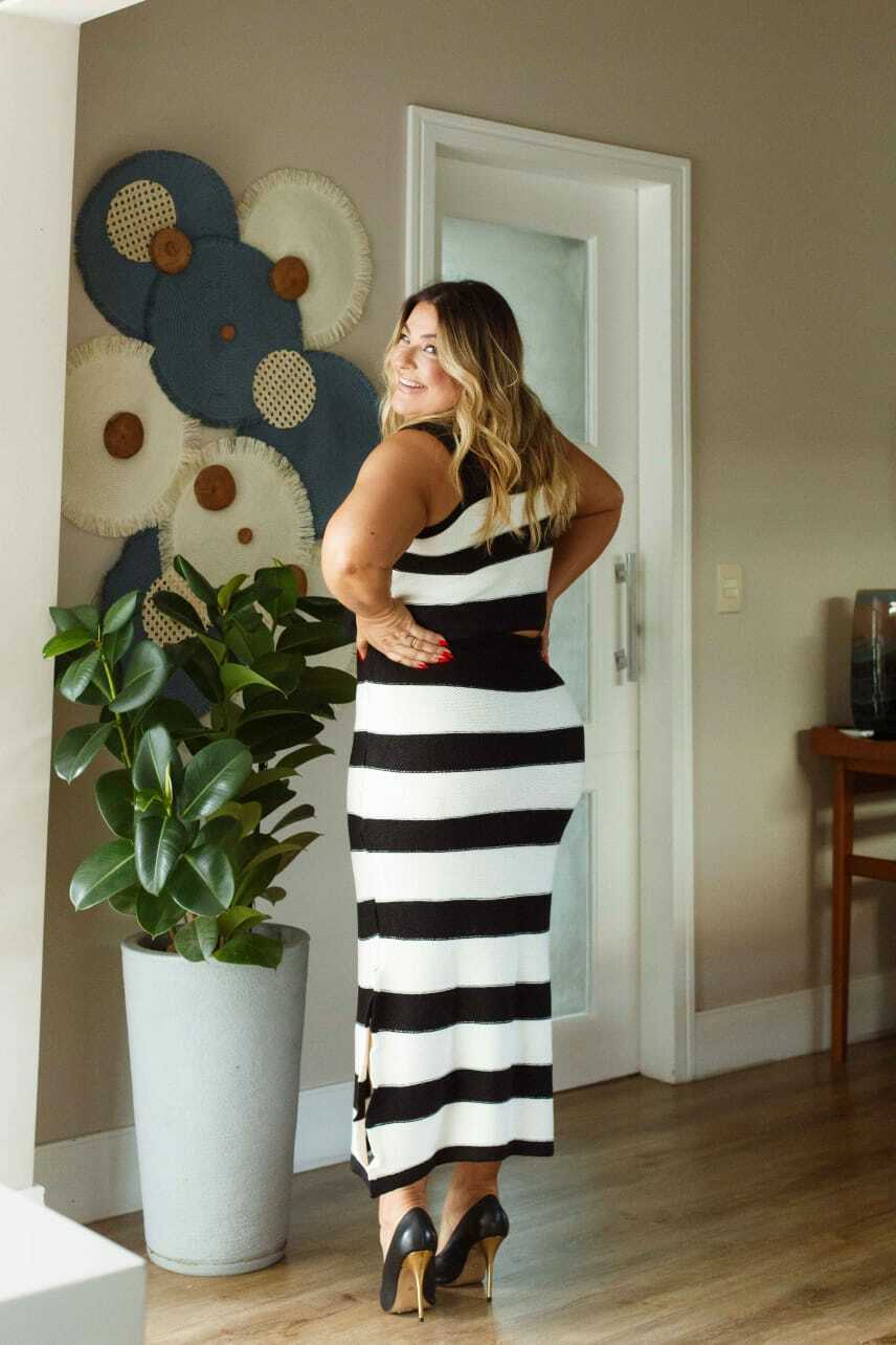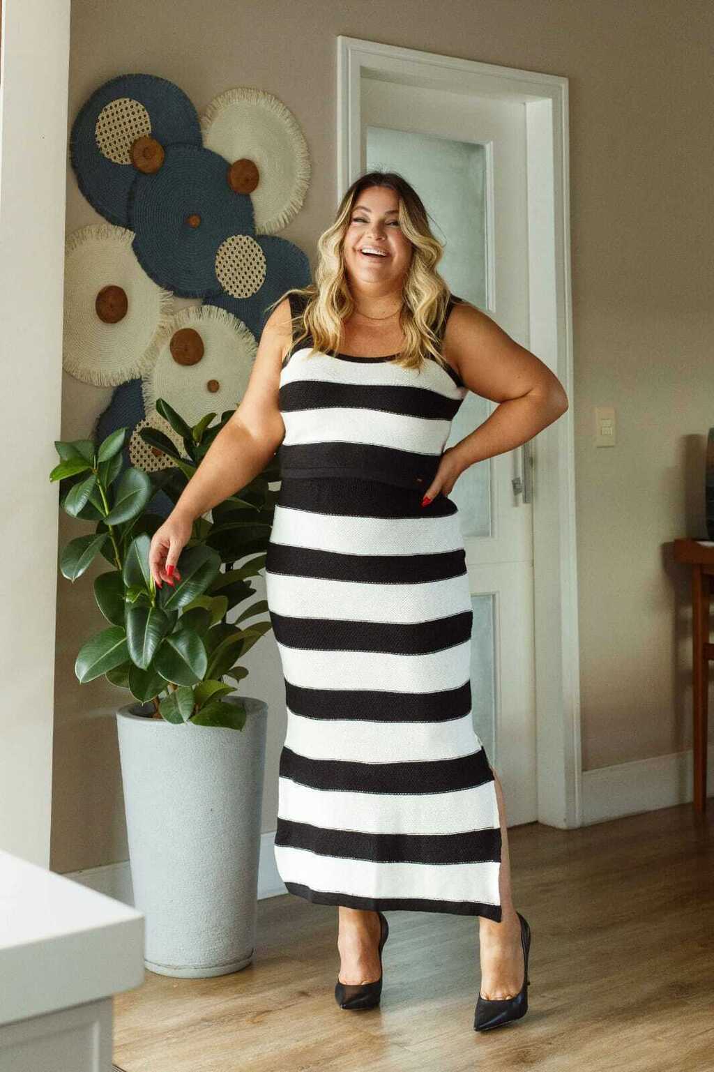 O Conjunto Listra Santorini é a tradução da elegância fresca e moderna do verão. Composto por saia e cropped, em tecido leve e confortável, ele traz a atemporalidade das listras preto e branco, perfeitas para looks sofisticados e versáteis.